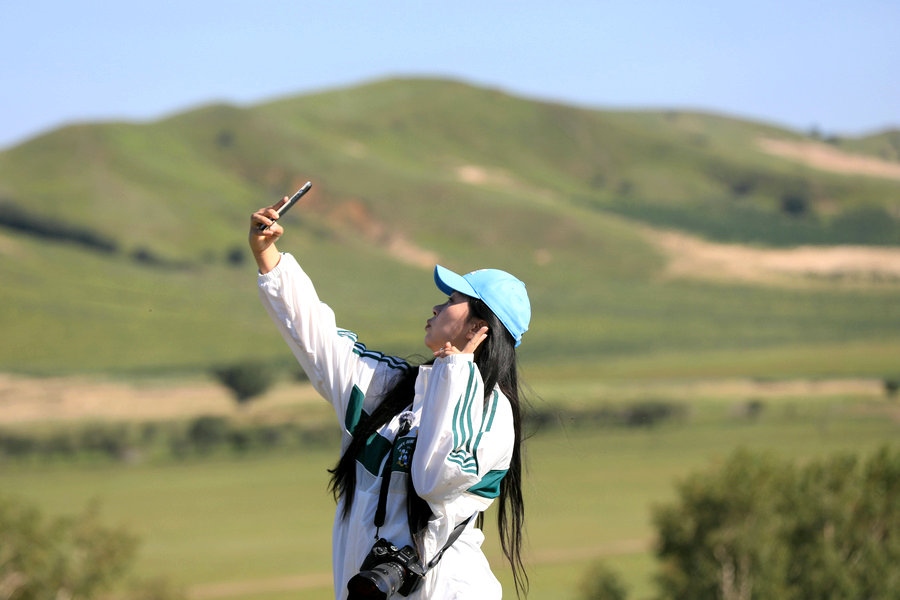 8月2日,游客在烏蘭布統(tǒng)草原拍照