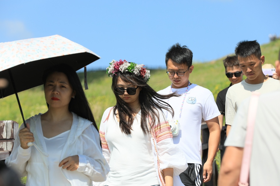 8月2日,游客在烏蘭布統(tǒng)草原打卡
