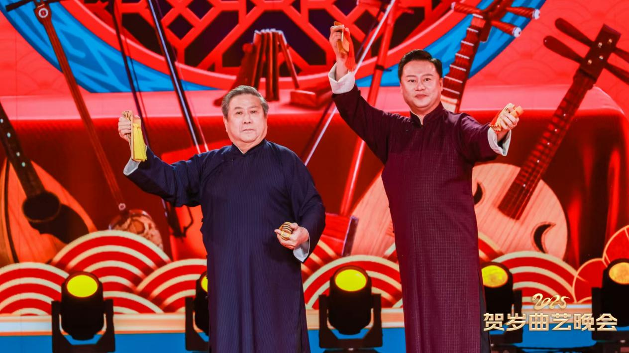 馮鞏、李志強的相聲《蛇年大吉》以成語接龍送祝福,嗨翻全場;張志寬師徒的快板書《立井架》展現(xiàn)李派快板的獨特魅力;盛小云、高博文的評彈和馮欣蕊、夏炎的京韻大鼓,盡顯傳統(tǒng)曲藝的優(yōu)雅韻味。