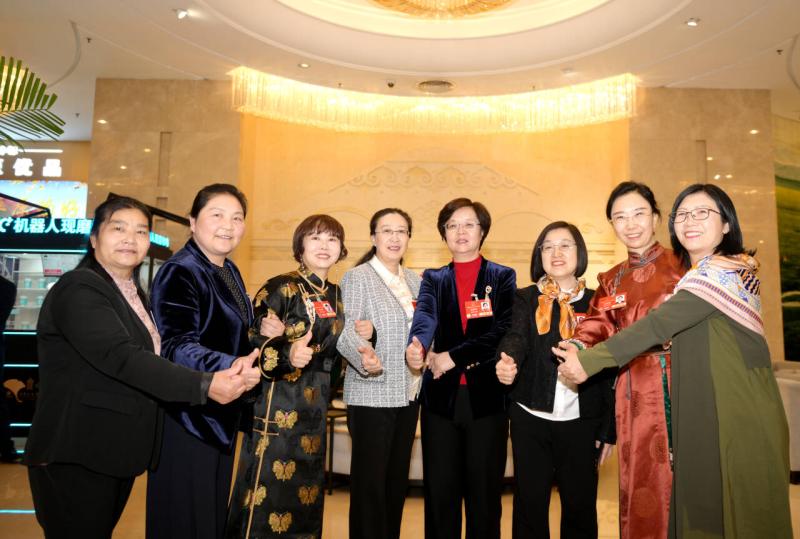 3月7日,參加十四屆全國人大三次會議的內(nèi)蒙古代表團(tuán)的部分女代表們在駐地合影,迎接即將到來的三八婦女節(jié),表達(dá)了對全國女性的美好祝愿。記者 馬建兵 攝