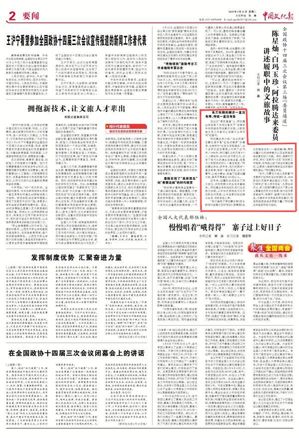 2025年3月11日,《中國文化報(bào)》第2版刊發(fā)了《烏蘭牧騎的腳步一直沒有停,傳統(tǒng)一直沒有丟》的文章,報(bào)道了3月10日,全國政協(xié)十四屆三次會議第三場“委員通道”集體采訪活動(dòng)在人民大會堂舉行,其中,全國政協(xié)委員、內(nèi)蒙古蘇尼特左旗烏蘭牧騎隊(duì)長阿拉騰達(dá)來在現(xiàn)場講述了履職中的文旅故事。