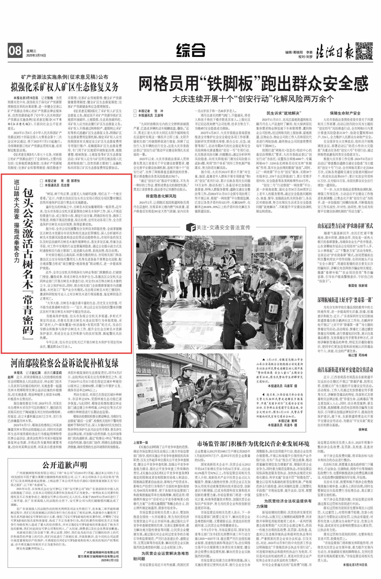 2025年3月19日,《法治日報》第8版刊發(fā)題為《巡山踏水大排查 攥指成拳聚合力 包頭公安激活古樹名木“常青密碼”》的文章,報道了近年來,包頭市各級公安機關緊緊圍繞古樹名木保護工作,深入開展巡控排查行動,成立領導小組、制定行動方案、明確目標任務、確保工作推進,積極開展巡控排查、綜合治理、宣傳發(fā)動各項工作,全力營造保護古樹名木良好氛圍,取得顯著成效。