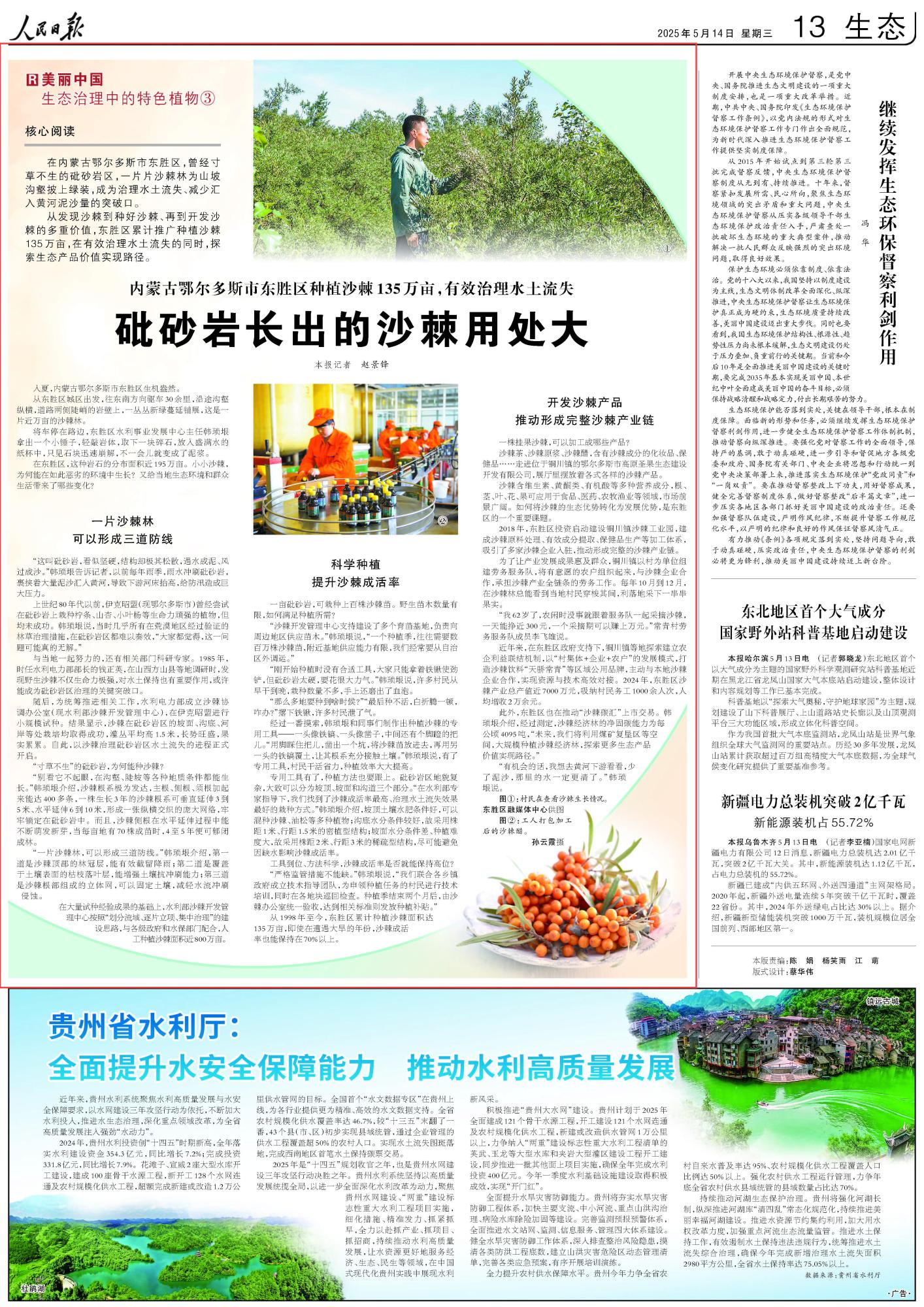 2025年5月14日《人民日報》第13版刊發(fā)了《內(nèi)蒙古鄂爾多斯市東勝區(qū)種植沙棘135萬畝,有效治理水土流失 砒砂巖長出的沙棘用處大》的文章,報道了內(nèi)蒙古鄂爾多斯市東勝區(qū)累計推廣種植沙棘135萬畝,在有效治理水土流失的同時,探索生態(tài)產(chǎn)品價值實現(xiàn)路徑。