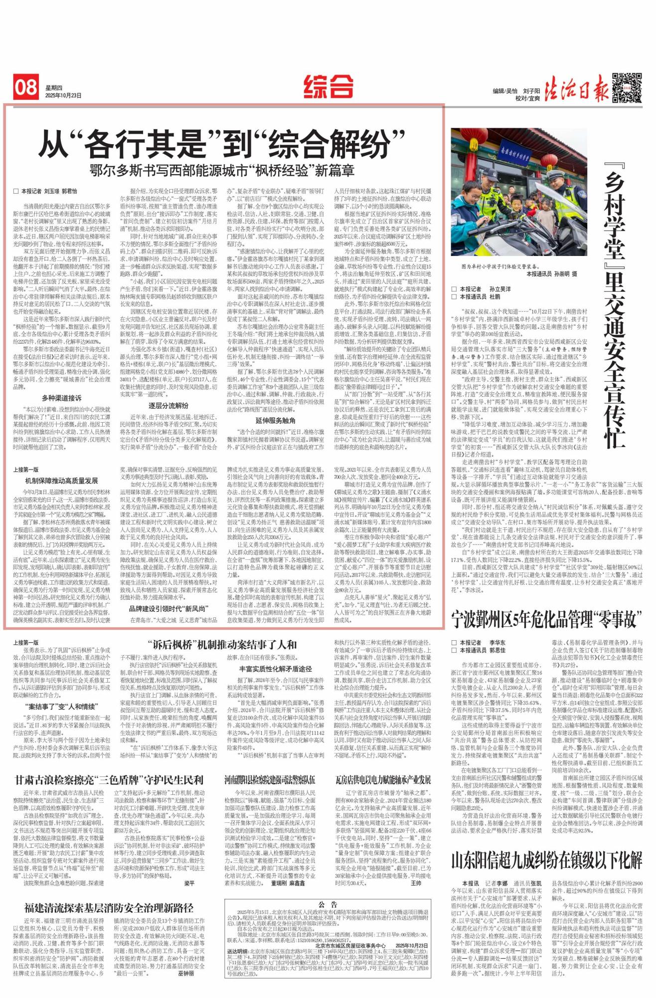 2025年10月23日,《法治日報(bào)》第8版刊發(fā)題為《從“各行其是”到“綜合解紛”鄂爾多斯書寫西部能源城市“楓橋經(jīng)驗(yàn)”新篇章》的文章,報(bào)道了鄂爾多斯市以綜治中心規(guī)范化建設(shè)為核心,深入踐行新時(shí)代“楓橋經(jīng)驗(yàn)”,通過多元舉措化解矛盾糾紛,全力打造“暖城善治”社會(huì)治理品牌。截至9月底,全市各級(jí)綜治中心累計(jì)受理各類矛盾糾紛22371件,化解率達(dá)96.03%。
