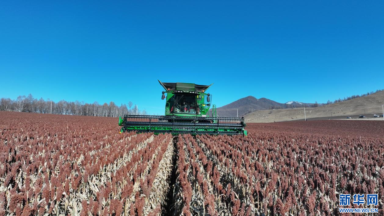 ??10月22日,在內(nèi)蒙古自治區(qū)呼倫貝爾農(nóng)墾綽爾河農(nóng)牧場有限公司田間,農(nóng)機手駕駛大型收割機收割高粱。新華網(wǎng)發(fā)(韓穎群 攝)