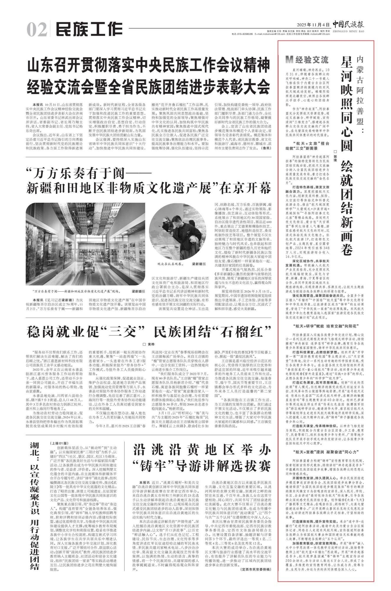 2025年11月4日,《中國(guó)民族報(bào)》第2版刊發(fā)題為《內(nèi)蒙古阿拉善盟:星河映照同心圓 繪就團(tuán)結(jié)新畫卷》的文章,報(bào)道了伴隨著各族群眾的歡呼吶喊,神舟二十一號(hào)載人飛船在位于內(nèi)蒙古自治區(qū)阿拉善盟額濟(jì)納旗境內(nèi)的東風(fēng)航天城成功發(fā)射。璀璨烈焰照亮北疆夜空,映照出各族群眾手拉手、心連心的團(tuán)結(jié)身影。