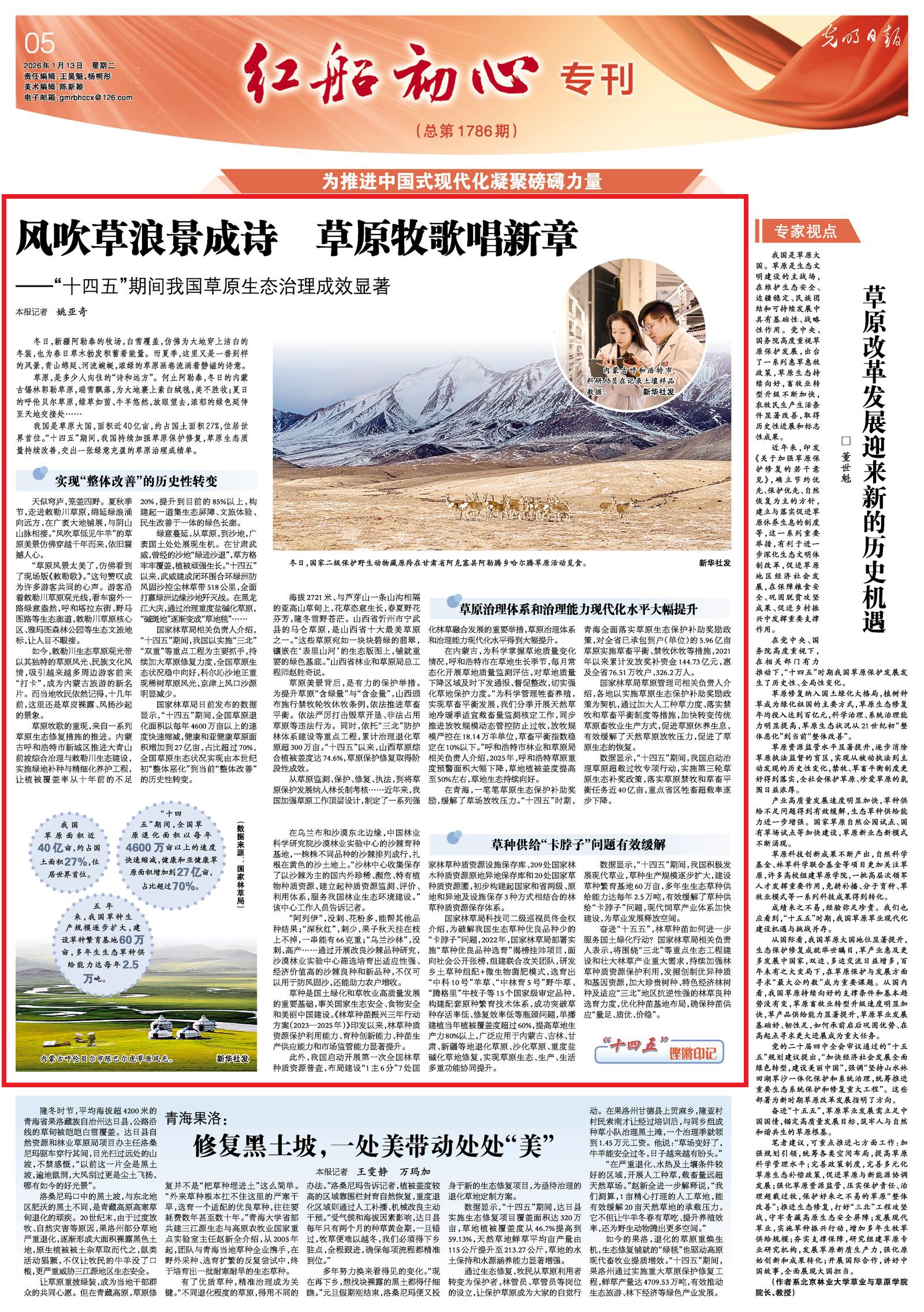 2026年1月13日,《光明日報》5版刊發(fā)題為《風(fēng)吹草浪景成詩 草原牧歌唱新章——“十四五”期間我國草原生態(tài)治理成效顯著》的文章,報道了“十四五”期間,我國持續(xù)加強草原保護修復(fù),草原生態(tài)質(zhì)量持續(xù)改善,交出一張綠意充盈的草原治理成績單。
