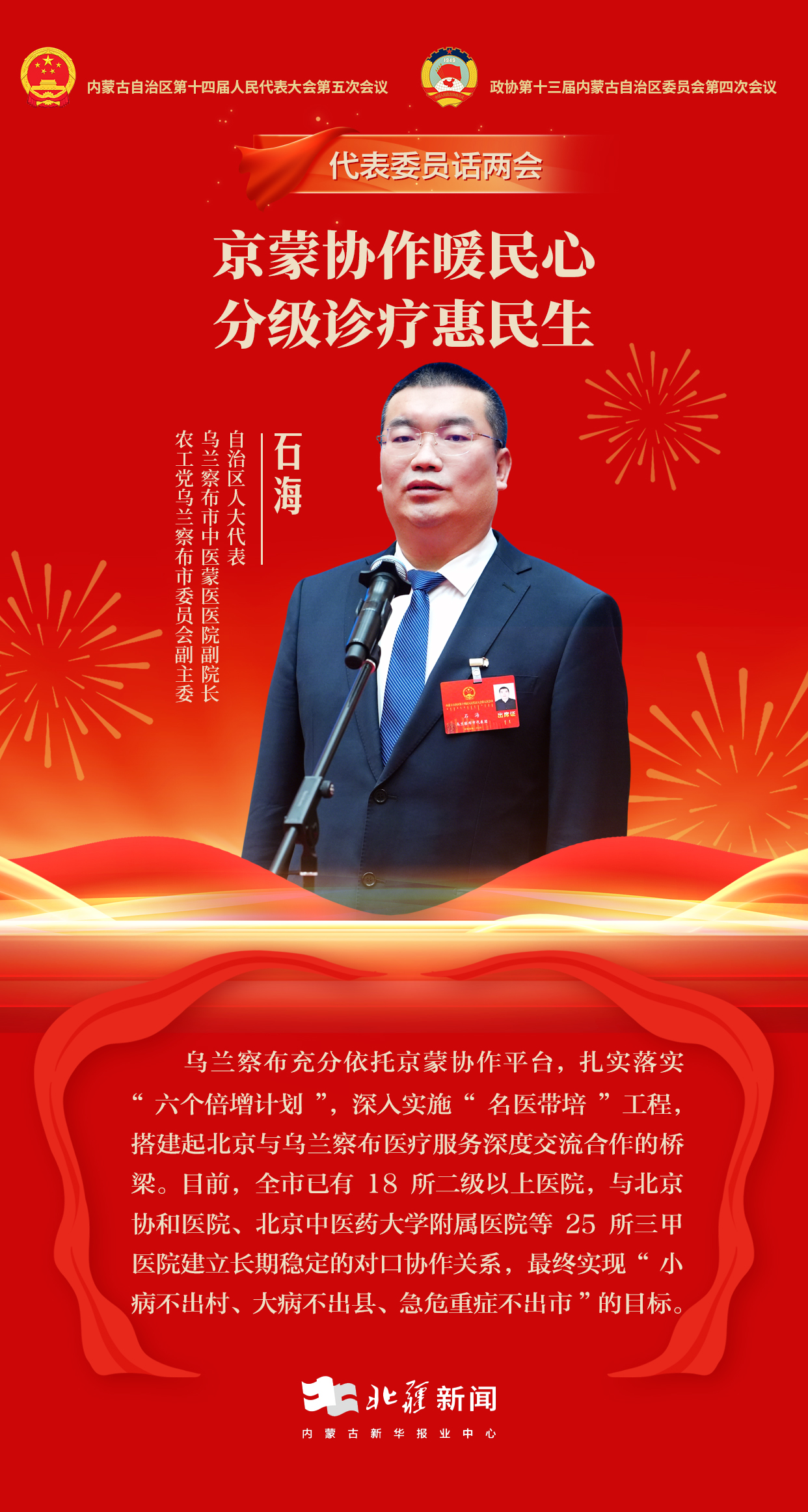 北疆新聞呼和浩特2月5日消息(記者 楊凈毓 李文華 張鑫) “‘病有良醫(yī)’是人民群眾的熱切期盼,而京蒙協(xié)作正是我們破解群眾看病就醫(yī)急難愁盼、提升醫(yī)療服務水平的關(guān)鍵抓手?!?月4日,內(nèi)蒙古自治區(qū)第十四屆人民代表大會第五次會議“代表通道”上,自治區(qū)人大代表、烏蘭察布市中醫(yī)蒙醫(yī)醫(yī)院副院長、農(nóng)工黨烏蘭察布市委員會副主委石海,暢談對京蒙協(xié)作引入優(yōu)質(zhì)醫(yī)療資源、推動分級診療發(fā)展的看法與實踐。