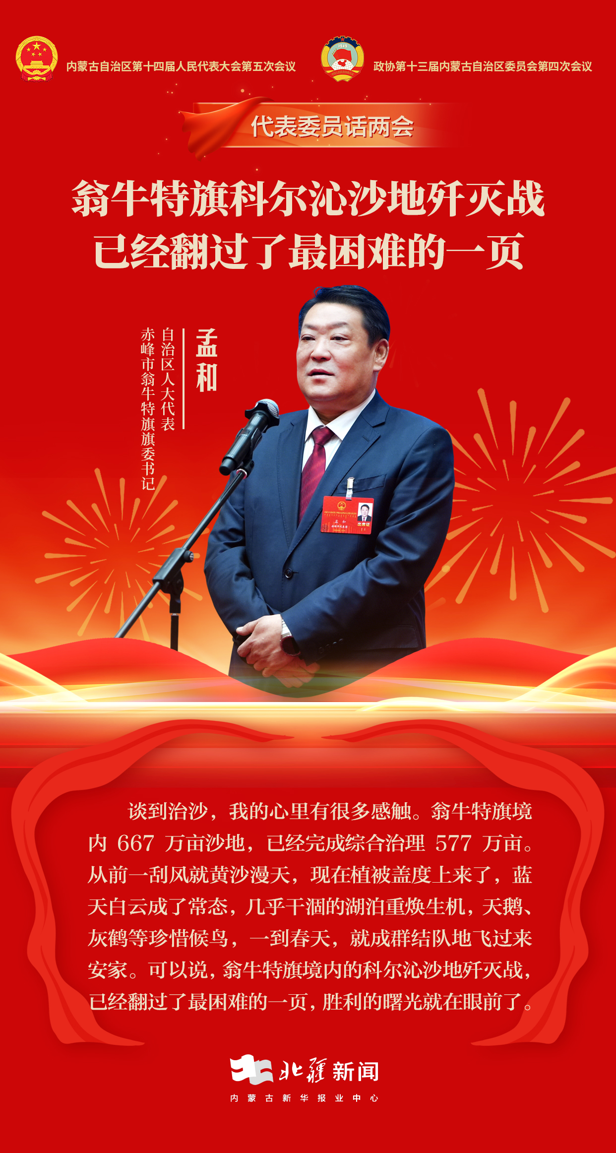 2月4日19時30分,在內(nèi)蒙古自治區(qū)第十四屆人民代表大會第五次會議“代表通道”上,孟和以樸實的話語開篇,講述翁牛特旗科爾沁沙地治理的攻堅故事與綠富同興的探索實踐。