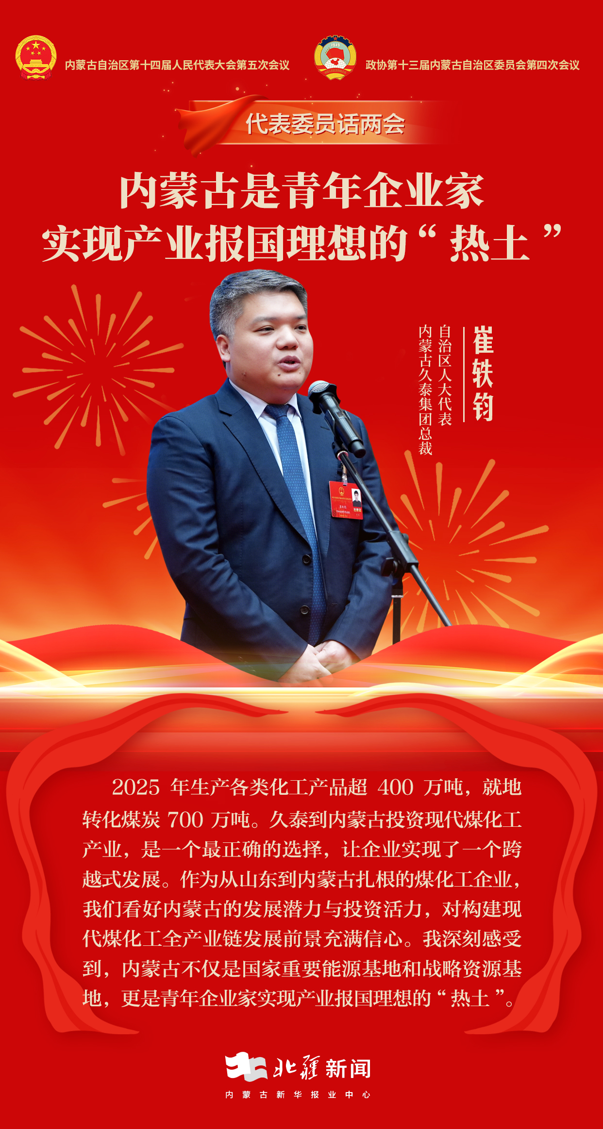作為扎根內(nèi)蒙古的青年企業(yè)家,崔軼鈞表示,他深刻感受到內(nèi)蒙古不僅是國(guó)家重要能源和戰(zhàn)略資源基地,更是青年企業(yè)家實(shí)現(xiàn)產(chǎn)業(yè)報(bào)國(guó)理想的“熱土”。