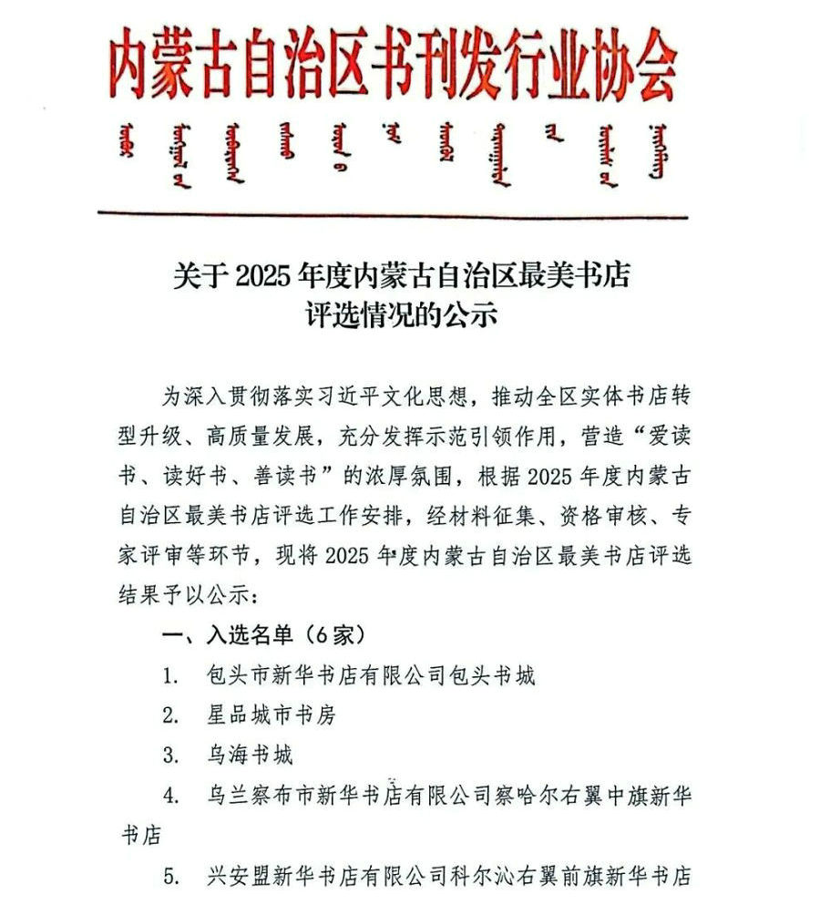 為深入貫徹落實習(xí)近平文化思想,推動全區(qū)實體書店轉(zhuǎn)型升級、高質(zhì)量發(fā)展,充分發(fā)揮示范引領(lǐng)作用,營造“愛讀書、讀好書、善讀書”的濃厚氛圍,根據(jù)2025年度內(nèi)蒙古自治區(qū)最美書店評選工作安排,經(jīng)材料征集、資格審核、專家評審等環(huán)節(jié),現(xiàn)將2025年度內(nèi)蒙古自治區(qū)最美書店評選結(jié)果予以公示:
