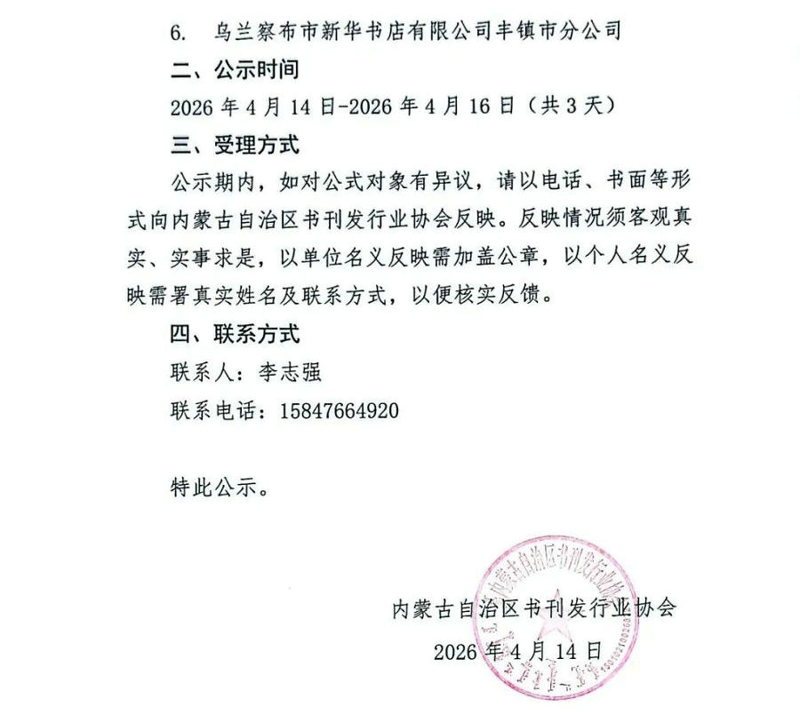 公示期內(nèi),如對公式對象有異議,請以電話、書面等形式向內(nèi)蒙古自治區(qū)書刊發(fā)行業(yè)協(xié)會反映。反映情況須客觀真實、實事求是,以單位名義反映需加蓋公章,以個人名義反映需署真實姓名及聯(lián)系方式,以便核實反饋。