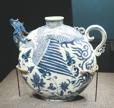一件精美的青花鳳首扁壺引人注目。此壺出土于北京舊鼓樓大街豁口以東一處元代院落遺址。壺身為扁圓形,以鳳首為流,鳳尾作柄,用青料在壺身上繪出展翅飛翔的鳳鳥,器形與紋飾渾然一體,構(gòu)思精絕?!斑@是首都博物館收藏的國家一級文物?!闭挛挠勒f,“青花瓷體現(xiàn)了元代承接唐宋并對不同文化兼容并蓄的時代氣象,元大都正是在這種氛圍中誕生的偉大杰作?!?/P>