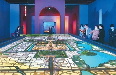走進(jìn)“壯美中軸”展區(qū),一個16米長的沙盤將北京中軸線沿線建筑全貌清晰呈現(xiàn)在眼前,帶給人強烈的視覺震撼。北起鐘鼓樓,南至永定門,北京中軸線全長約7.8公里,是世界上現(xiàn)存最長的城市中軸線。沙盤上的立體投影模擬出晝夜交替、四季輪轉(zhuǎn)的景象,讓人仿佛穿越時空,感受中軸線的歷史演變。沙盤兩側(cè)的電子屏滾動播放著三維動畫,立體展現(xiàn)故宮、天壇、景山等中軸線重要遺產(chǎn)點。