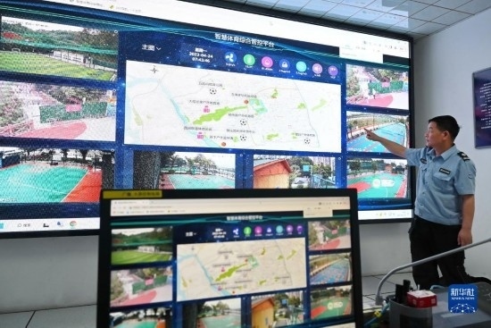 4月24日,西河智慧體育公園工作人員在介紹智慧體育綜合管控平臺(tái)。該平臺(tái)可對(duì)公園內(nèi)的人流、安全、環(huán)境以及公園周邊“15分鐘健身圈”運(yùn)動(dòng)場地的門禁、燈光等設(shè)備實(shí)現(xiàn)智能化管理。