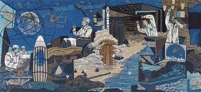 “大國(guó)重器”亮點(diǎn)紛呈,脫貧攻堅(jiān)成就舉世矚目,這些時(shí)代新象都在展覽中得到體現(xiàn)。例如,張輝君油畫《蛟龍入?!贰⑸秤绤R版畫《北斗》等作品,折射出我國(guó)科技自主創(chuàng)新能力不斷提升??鬃现袊?guó)畫《戈壁灘》和劉云中國(guó)畫《美麗鄉(xiāng)村》,分別借助植樹造林的人物群像塑造、新農(nóng)村景觀的宏闊描繪,展現(xiàn)了彪炳史冊(cè)的人間奇跡。