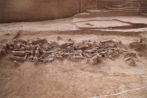 在“郭城”東南拐角處,發(fā)現(xiàn)一條殷墟時期的大型祭祀溝,長達19.36米,溝內堆疊了3層人骨及動物骨骼,初步清理出完整的人骨3具,以及肢解的牛骨、豬骨、馬骨、鳥骨等,經(jīng)動物考古學家辨認至少分屬17個動物個體??脊趴碧竭€發(fā)現(xiàn)不同時期的道路遺跡穿過城壕,為探討洹北商城內外部交通路網(wǎng)提供了重要線索。