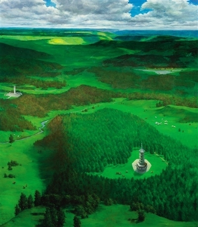 河北塞罕壩林場(chǎng),是“三北”工程建設(shè)的重要區(qū)域?;脑兞趾5娜眽纹孥E,成為近年來(lái)主題性美術(shù)創(chuàng)作的重要課題。入選“筑夢(mèng)——我們的新時(shí)代美術(shù)攝影作品展”的譚智群油畫(huà)《美麗的塞罕壩》,是在實(shí)地寫(xiě)生基礎(chǔ)上的藝術(shù)提煉和情感升華。作者以俯視的構(gòu)圖,鋪展?jié)M目蒼翠的美景。畫(huà)面左側(cè),清澈的河流蜿蜒向前;畫(huà)面右側(cè),白色的雁群逐綠翱翔;遠(yuǎn)方,茂密的森林不斷延伸,風(fēng)力發(fā)電機(jī)林立于山巔,畫(huà)面充滿生機(jī)與活力。同樣以俯視的角度處理構(gòu)圖,孔亮油畫(huà)《美麗中國(guó)——塞罕壩》則以塞罕壩林場(chǎng)和塞罕塔為視覺(jué)中心,蔥蘢的綠意,將意境渲染得更加深邃。翁凱旋油畫(huà)《滄海桑田——塞罕壩的前世今生》,通過(guò)三聯(lián)畫(huà)的形式,在新舊對(duì)比中構(gòu)建時(shí)空長(zhǎng)廊,描繪出塞罕壩的時(shí)代變遷。