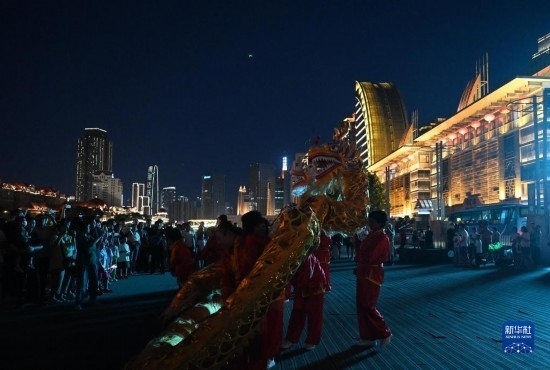 6月22日,人們?cè)谔旖蚝:庸盼幕执a頭附近欣賞舞龍表演。