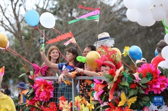 這是9月23日在新西蘭黑斯廷斯拍攝的“迎春花車巡游日”活動現(xiàn)場。