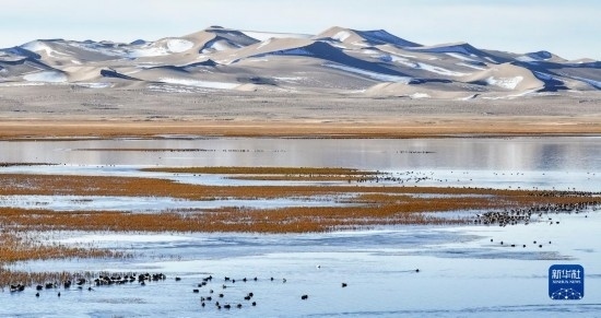 10月18日,在阿爾金山國(guó)家級(jí)自然保護(hù)區(qū),針尾鴨等水鳥在依協(xié)克帕提湖棲息(無(wú)人機(jī)照片)。