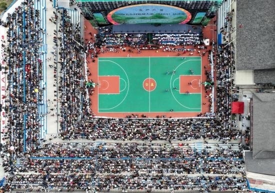 這是10月25日拍攝的全國和美鄉(xiāng)村籃球大賽(村BA)總決賽現(xiàn)場(無人機照片)。新華社記者 歐東衢 攝