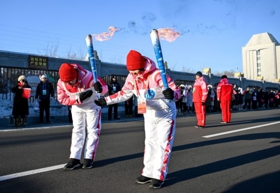 2月3日,在內(nèi)蒙古呼倫貝爾市滿洲里國門景區(qū),火炬手包玲玲(右)和錢卓在火炬?zhèn)鬟f活動中。新華社記者 連振 攝