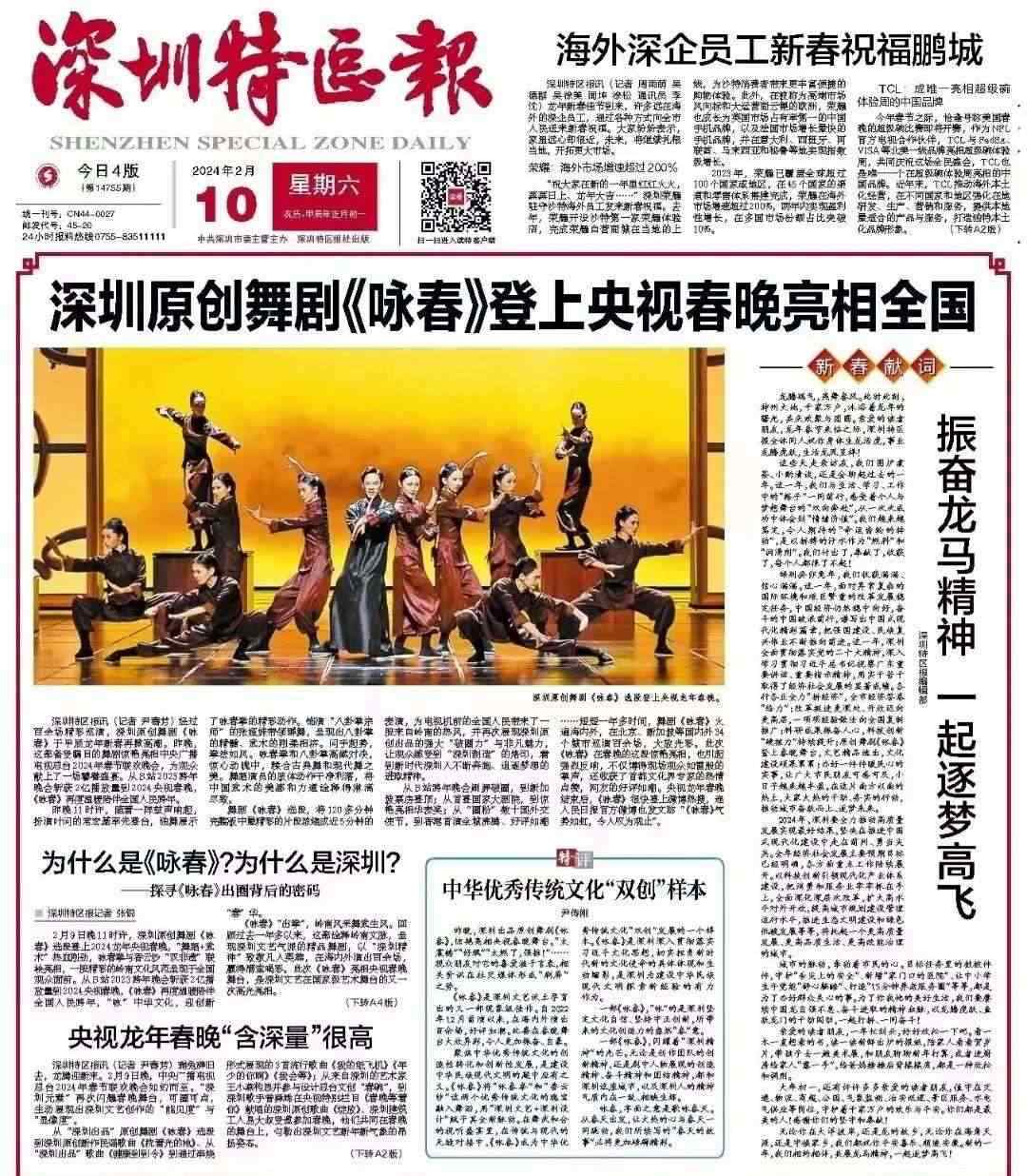 《深圳特區(qū)報(bào)》在大年初一頭版頭條對(duì)《詠春》做了報(bào)道。光明日?qǐng)?bào)原總編輯何東平等首都文化界專家學(xué)者在采訪中紛紛為《詠春》成功登陸春晚大舞臺(tái)而點(diǎn)贊。