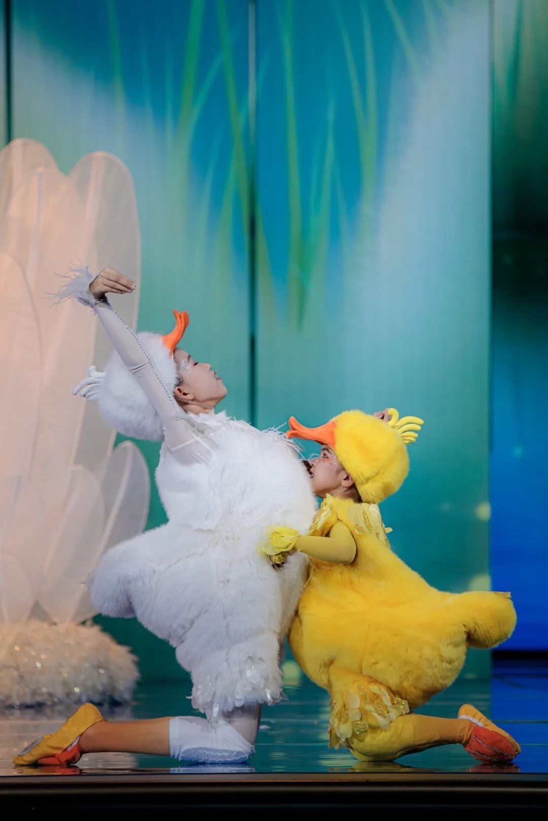 在初始版本中只有“小白鵝”,總臺(tái)臺(tái)長提出要把孩子們的憨態(tài)可掬呈現(xiàn)得更極致一些,要有幽默感、有劇情感,并建議增加一只“搗亂”的“小黃鴨”。經(jīng)過重新編排,舞蹈一下子有了更多靈氣,“小黃鴨”穿梭在大小白鵝之中,不僅讓整體清冷的色調(diào)增加了一抹暖色,還讓舞蹈內(nèi)容更加豐富,童趣更加飽滿。