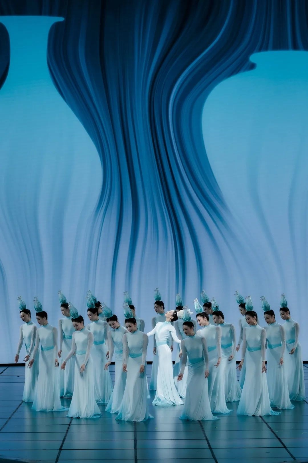 《瓷影》正是以青白瓷為視覺出發(fā)點(diǎn),演出服裝在色彩上著墨,提取“青”“白”這兩種傳統(tǒng)“正色”,展現(xiàn)出大繁若簡(jiǎn)的東方美學(xué)。通過舞者的肢體語言展現(xiàn)青白瓷跨越千年的獨(dú)特魅力。