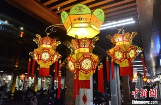 圖為2月20日晚,泉州中山路騎樓兩側(cè),花燈流光溢彩,美不勝收。中新網(wǎng)記者 張斌 攝