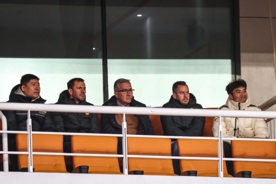 3月6日,中國國家男子足球隊主教練伊萬科維奇(中)在2023-2024賽季亞冠聯(lián)賽四分之一決賽首回合現(xiàn)場觀看比賽。新華社記者 朱崢 攝