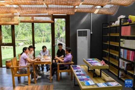 北京石油化工學(xué)院的師生在石峽村的一間書屋里就鄉(xiāng)村文旅調(diào)研進(jìn)行討論(5月31日攝)。