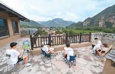 在位于山西省左權(quán)縣澤城村的中國北方國際寫生基地澤城驛站內(nèi),山西工學(xué)院的學(xué)生們?cè)诋嫯?。新華社記者 楊晨光攝