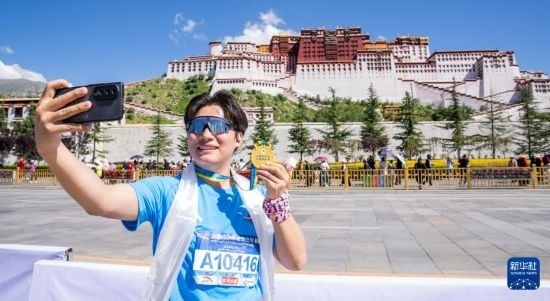 8月17日,參賽選手完賽后在布達(dá)拉宮前手舉獎(jiǎng)牌拍照留念。