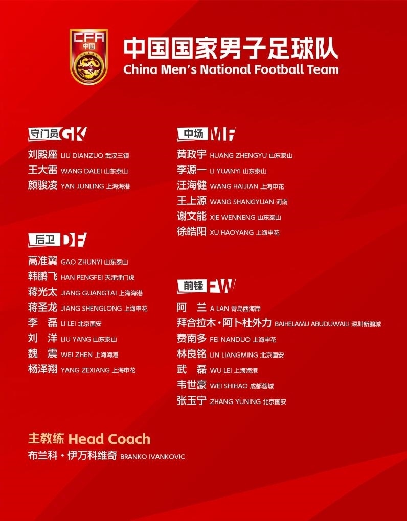 以下為24人大名單:武磊、顏駿凌、蔣光太、魏震(上海海港),王大雷、劉洋、高準翼、黃政宇、謝文能、李源一(山東泰山),韋世豪(成都蓉城),費南多、蔣圣龍、徐皓陽、楊澤翔、汪海?。ㄉ虾I昊ǎ?,李磊、張玉寧、林良銘(北京國安),劉殿座(武漢三鎮(zhèn)),韓鵬飛(天津津門虎),王上源(河南),拜合拉木·阿卜杜外力(深圳新鵬城),阿蘭(青島西海岸)。