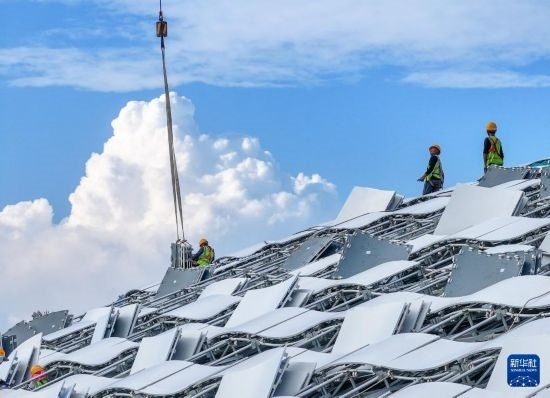 10月16日,中建深裝施工人員在深圳市體育中心專業(yè)足球場屋頂?shù)跹b幕墻材料(無人機照片)。