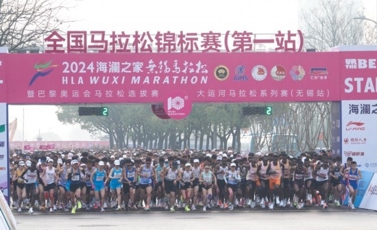 3月24日,參賽選手在比賽中出發(fā)。當(dāng)日,2024無(wú)錫馬拉松暨全國(guó)馬拉松錦標(biāo)賽(第一站)、巴黎奧運(yùn)會(huì)馬拉松選拔賽、大運(yùn)河馬拉松系列賽(無(wú)錫站)在江蘇省無(wú)錫市舉行。新華社記者 楊磊 攝