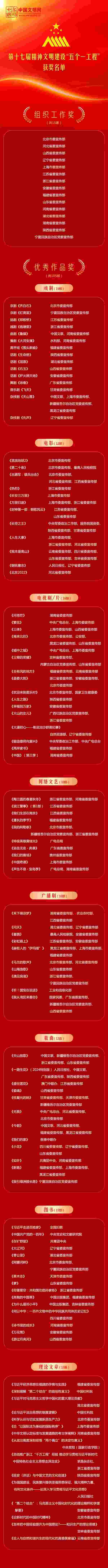 近日,中共中央宣傳部印發(fā)表彰決定,對第十七屆精神文明建設(shè)“五個(gè)一工程”組織工作先進(jìn)單位和優(yōu)秀作品進(jìn)行表彰。授予《齊白石》等15部戲劇作品、《流浪地球2》等12部電影作品、《問蒼?!返?6部電視作品、《陶三圓的春夏秋冬》等10部網(wǎng)絡(luò)文藝作品、《禾下乘涼夢》等10部廣播劇、《天山放歌》等12首歌曲,共105部作品“優(yōu)秀作品獎(jiǎng)”;授予北京、河北、山西、遼寧、上海、江蘇、浙江、安徽、福建、山東、河南、湖北、湖南、陜西、寧夏等15個(gè)省區(qū)市黨委宣傳部“組織工作獎(jiǎng)”。