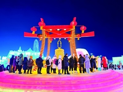 游客在哈爾濱冰雪大世界參加祈?;顒?dòng)。