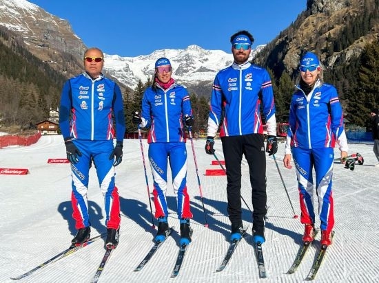 2022年1月24日,泰國越野滑雪隊(duì)運(yùn)動(dòng)員卡倫·尚隆(左二)、馬克·尚隆(左三)與父母在歐洲備戰(zhàn)訓(xùn)練時(shí)合影。新華社發(fā)(受訪者供圖)