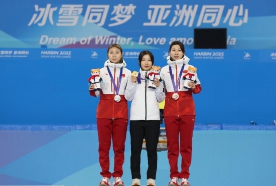 2月8日,冠軍韓國(guó)選手金吉莉(中)、亞軍中國(guó)選手公俐(左)和季軍中國(guó)選手臧一澤在頒獎(jiǎng)儀式上合影。當(dāng)日,在哈爾濱舉行的第九屆亞冬會(huì)短道速滑女子1500米A組決賽中,韓國(guó)選手金吉莉奪得冠軍,中國(guó)選手公俐、臧一澤分別獲得亞軍、季軍。新華社記者 張濤 攝