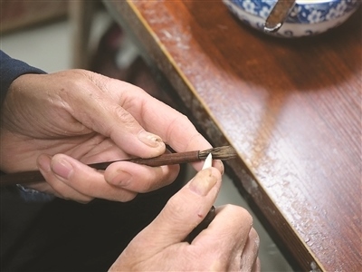 把毛料放在水中仔細清洗,就著燈光剔除一根根細微雜毛,將清理后的毛料聚合成圓直光滑、攏抱不散的錐形……走進涇縣涇川鎮(zhèn)宣筆制作技藝代表性傳承人佘征軍的工作室,他正在為一支紫毫筆制作筆頭?!鞍拙右子性娫疲侵瞬蔀楣P,千萬毛中揀一毫’。此句講的是宣筆制作工藝的復(fù)雜精細?!辟苷鬈娬f。