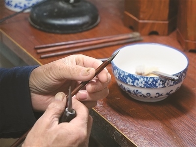 “無論是制作哪一類品種的宣筆,要能實現(xiàn)‘尖、齊、圓、健’均屬不易,需經(jīng)歷選料、水盆、制桿、裝套等多道工序、100多個環(huán)節(jié)。”以制桿為例,佘征軍介紹,工人需要先將筆桿磨平,再用工具在筆桿上挖出裝筆頭的洞,這套工藝沒有特定的參數(shù)可參考,全憑工人的手上感覺?!皩W(xué)徒入行,一般3到5年才能完整學(xué)會宣筆制造流程;要想做出一支優(yōu)秀的宣筆,至少10到12年的學(xué)習(xí)實踐;而要想學(xué)‘精’,需要一輩子的時間。”佘征軍說。