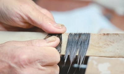 制作筆頭從理毫開始,將毛的根部理齊。然后整理毛的頭部,這一步叫齊毫。齊毫后的筆毛變成一片一片的,方便做成圓錐形。圖為齊毫。