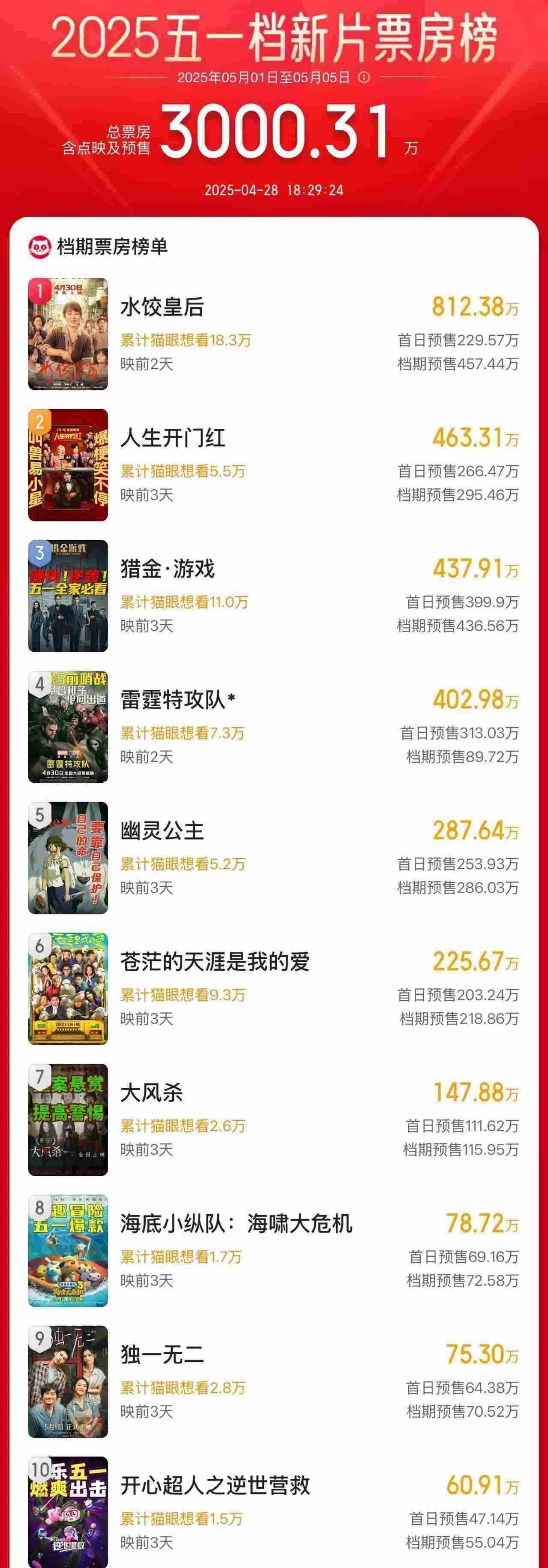據(jù)網(wǎng)絡(luò)平臺數(shù)據(jù),截至4月28日18時29分,2025年“五一”檔新片預(yù)售總票房破3000萬,《水餃皇后》《人生開門紅》《獵金·游戲》分列前三位。