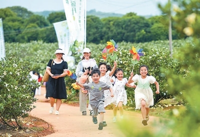 江西省樟樹(shù)市義成鎮(zhèn)羅港村黃梔子種植基地,游客在賞花游玩。