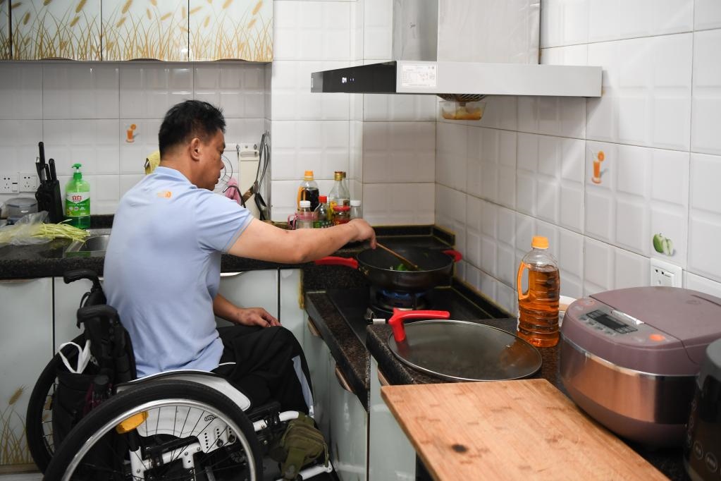 2021年8月25日,一位殘疾人在湖南省長沙市天心區(qū)家中的定制低位灶臺上炒菜。新華社記者 薛宇舸 攝