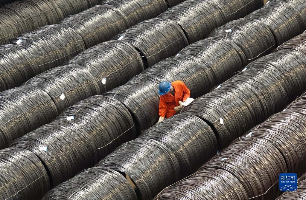 2017年5月15日,東北特鋼集團(tuán)工作人員在核對(duì)入庫(kù)的合金鋼大盤重線材產(chǎn)品標(biāo)識(shí)。新華社發(fā)(劉德斌 攝)