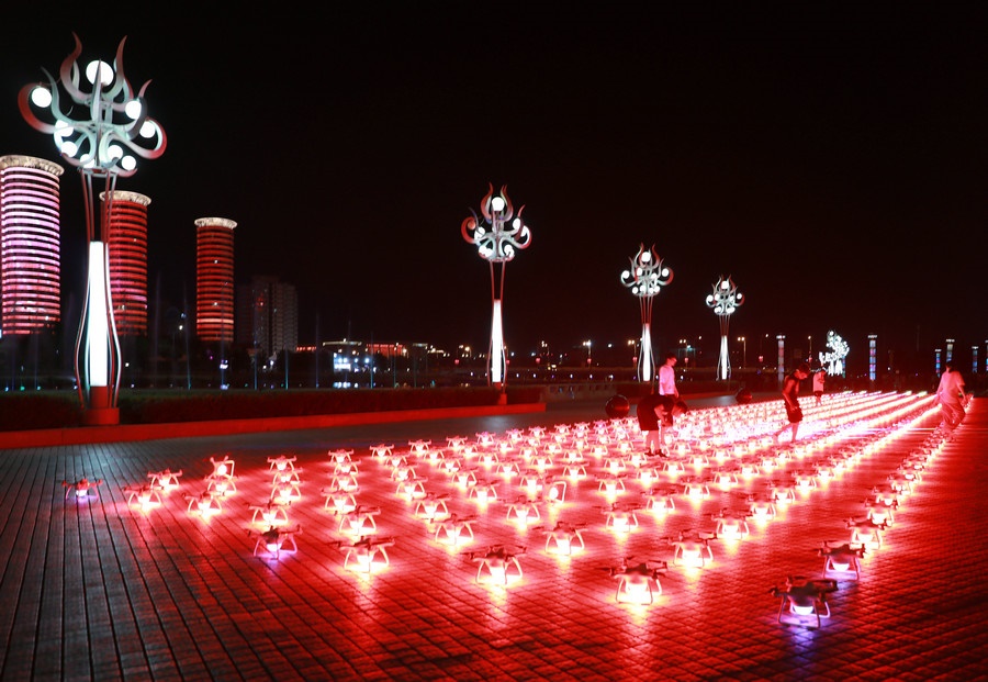 7月30日凌晨1:10,500架無人機(jī)在呼和浩特東河廣場(chǎng)騰空而起,如點(diǎn)點(diǎn)星光組成的動(dòng)態(tài)燈光秀,幻化成20余幅震撼畫面,“建設(shè)亮麗內(nèi)蒙古,共圓偉大中國夢(mèng)”、“江山就是人民,人民就是江山”、“一心聽黨話,鐵心跟黨走”、“草原兒女心向黨”、“蒙古馬精神”、“亮麗內(nèi)蒙古”、“美麗青城草原都市”等一幅幅絢麗的文字和畫面,配上動(dòng)感激昂的音樂,效果驚艷,現(xiàn)場(chǎng)觀眾贊嘆連連。
